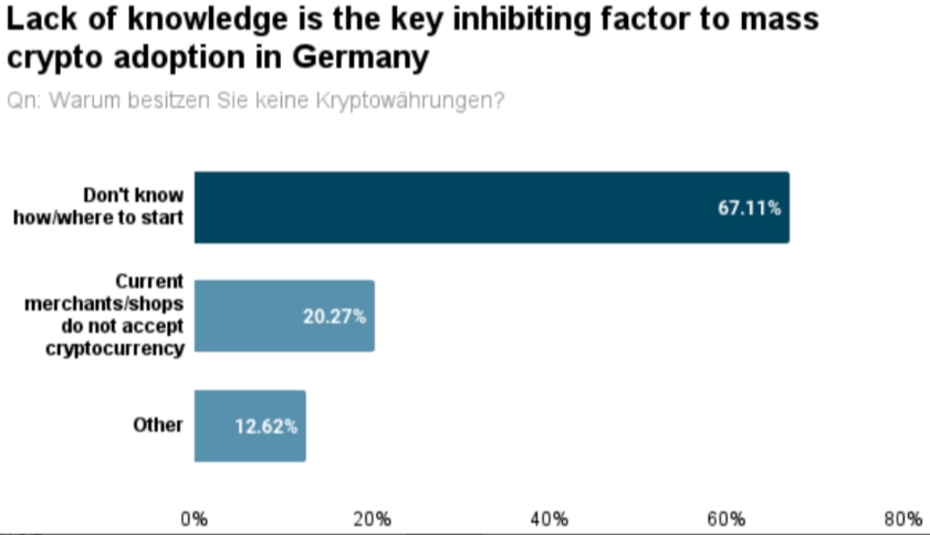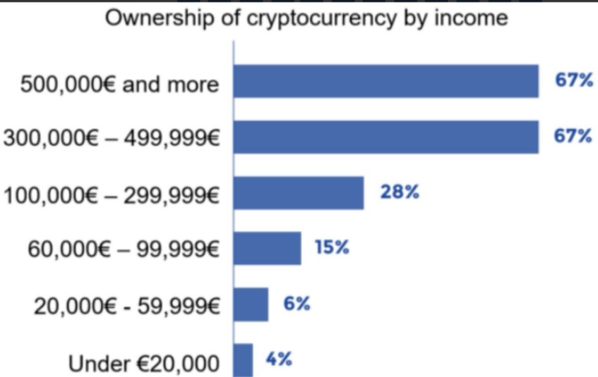 数据显示,按收入细分,高收入人群拥有的加密货币数量要高得多。接受调查的德国人中,67%的人年收入超过80万欧元,其中44%的人年收入在20万欧元至80万欧元之间,至少是其他收入群体的两倍。