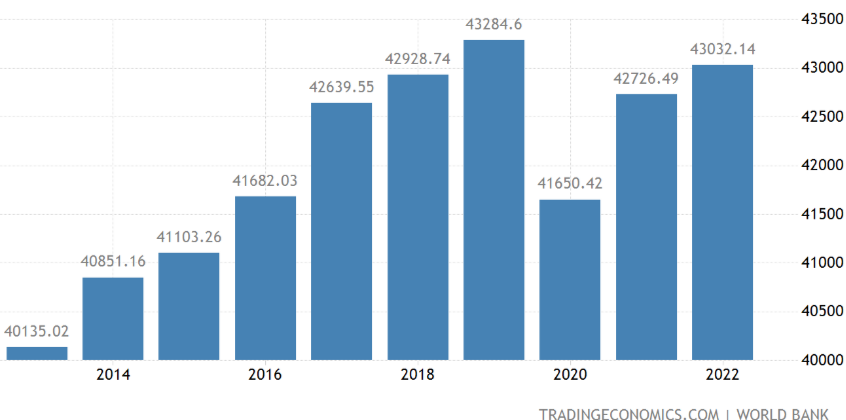 德国是世界第四大经济体,也是欧洲最大的经济体。截至2022年,德国人均GDP为43032.14美元相当于世界平均水平的341%。1970年至2022年,德国人均GDP为31,527.69美元,2019年达到历史最高点43,284.60美元,历史最低点为1970年17,894.30美元,德国人均年收入为53,390美元,是高收入国家之一。即使考虑购买力平价,它仍然是世界上最富有的20个国家之一。