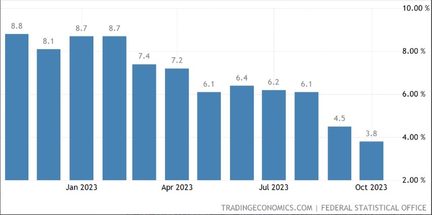 2023年10月,德国消费者价格通胀率确认为同比3.8%,较上月的4.5%大幅放缓。最新数据创两年多来最低水平,食品通胀跌至2022年2月以来最低水平(6.1%,9月为7.5%),能源价格近三年来首次下跌(-3.2%,9月为7.5%)。9月份为1.0%)。