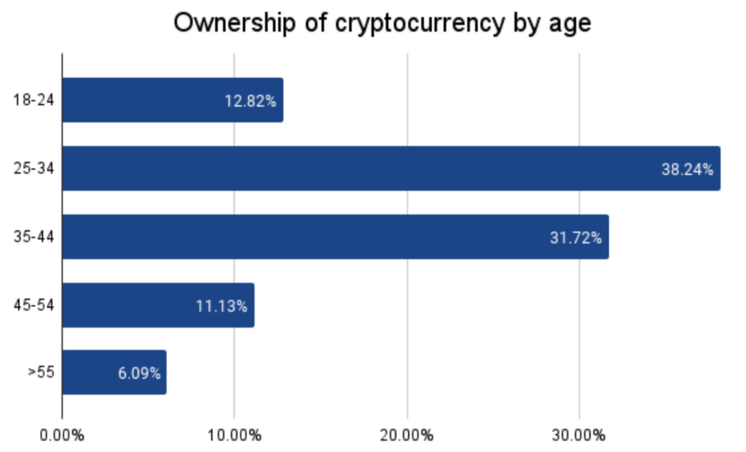 一项调查显示,德国大多数加密货币持有者年龄在 25 至 44 岁之间(约占70%)。数字资产对于年轻人来说通常是一件有趣的事情,因为他们对创新更加开放。Z世代(18-24岁)仅占所有接触加密货币市场的德国人的12.82%,而55岁及以上的人仅占6.09%。这表明加密货币主要由德国千禧代(1981-1996)持有。