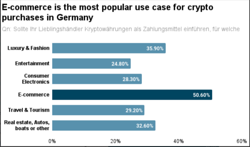 TripleA的一项调查显示,整个零售行业都对加密货币支付服务充满期待。受访者对娱乐、电子商务和奢侈品零售等所有主要类别都表现出了兴趣。其中,电子商务中加密货币的使用率最高,为50.6%,其次是奢侈品零售中的35.9%和旅行支付中的29.2%,购房、汽车等重资产购买中的32.6%。