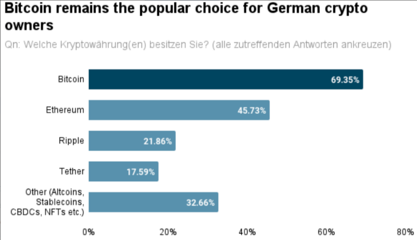 BTC仍然是德国加密货币持有者最受欢迎的选择,约69.35% 的受访者拥有比特币。由于应用广泛,ETH紧随其后,占45.73%。其次是Ripple(XRP)占21.86%,Tether(USDT)占 17.59%其他山赛币占 32.66%。