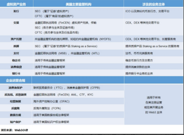 美国政府有必要出于(i)保护投资者及消费者的利益;(i)规范 Web3 行业长远健康发展,这两个基本立场对虚拟资产进行监管。目前,美国政府部门目前主要针对各种类别的虚拟资产((Digital Assets)进行监管(包括但不限于虚拟货币 Cryptocurrency、Non-Fungible Tokens (NFT)、稳定币等),并对由虚拟资产衍生出来的服务及服务商提出合规资质要求,如交易所、支付、托管、质押等业务,以及对去中心化的 DeFi协议、DAO 等进行监管探索。