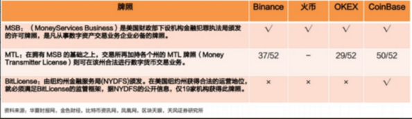 2021年4月14日,Coinbase Global, Inc.(COIN.US)通过直接上市(DPO)的方式成功登入纳斯达克,成为在美国上市的第一家虚拟资产综合服务商。Coinbase 以合规化著称,拥有美国纽约州 BitLicense 牌照以及信托牌照,在美国各个州拥有 MTL 牌照,还拥有英国 FCA 与爱尔兰央行的电子货币服务牌照,能够提供法币入金和币币交易等多项虚拟资产服务。公司自身也因为需要合规上市的原因,并未发行任何平台 token,也并未开展风险更高的衍生品业务,相比于其他 CEX 交易所如 Binance、Huobi、OKEx而言,Coinbase 堪称保守”。