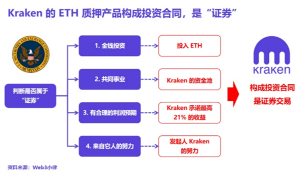 Kraken 提供的 STaaS 产品与以太坊或者 ETH 质押(Solo Staking)存在巨大区别。首先 Kraken 收到了投资者的资金(完全控制);其次资金混同于资金池,被Kraken 用于共同的事业(具体做什么不得而知);再次 Kraken 确实承诺了最高 21% 的收益回报(以太坊基金会官网上 ETH Staking 的回报在 3%-5% 左右);最后投资者仅参与投资,通过 Kraken 的努力来实现回报。这就满足了 Howey测试的全部条件,构成“投资合同”,属于证券交易。