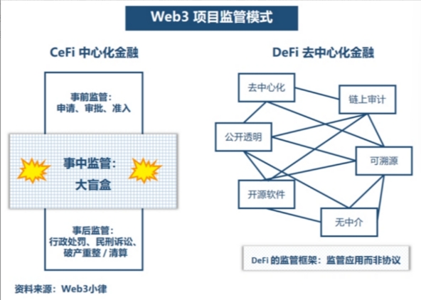 为 CeFi 设计的传统金融监管框架不应适用于 DeFi,因为两者在本质上存在差异。对于 CeFi,法律法规旨在消除金融中介机构的信任风险,以降低可能出现的利益冲突或欺诈行为。而对于 DeFi,区块链技术具有公开透明、去中心化和无需信任背书的特征,直接消灭了市场上的金融中介,那么就自然而然地解决了 CeFi 监管想要解决的问题,并且 DeFi 在很多方面比严格监管的 CeFi 做的更好,如区块链公开透明、可审计可追溯的特征就直接解决了 SEC 的毕生追求--信息披露完全。因此,将 CeFi 监管大规模应用于不存在金融中介的去中心化 Web3 应用是不合逻辑的,去中心化 Web3 应用已经早早实现了 CeFi 监管的目标,如透明度、可审计性、可追溯性、负责任的风险管理等。