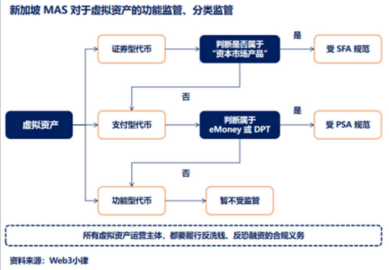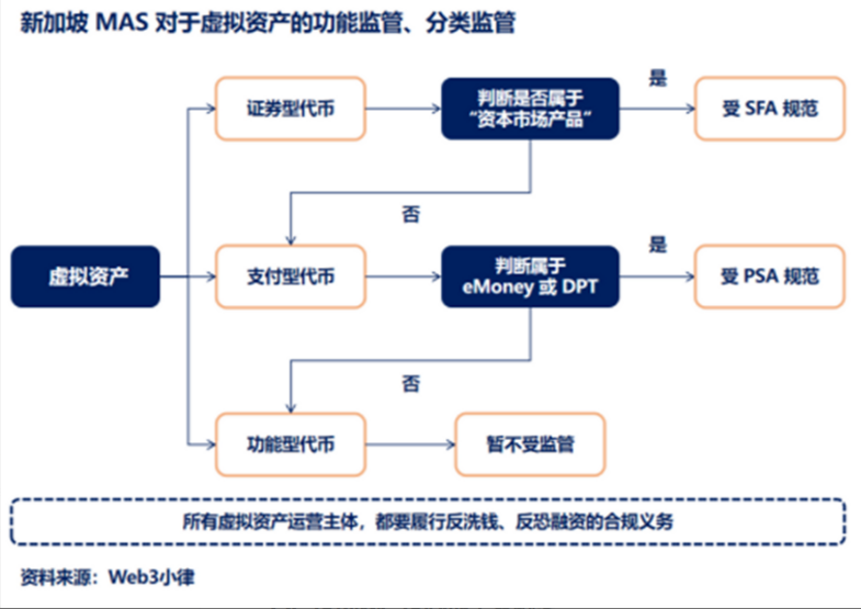 新加坡金融管理局(Monetary Authority of Singapore,MAS)是新加坡的中央银行和综合金融监管机构,同时负责监管 Web3 行业。MAS 对虚拟资产采取功能监管、分类监管的思路,从而进行合法化的监管,但区别于货币。MAS 根据虚拟资产的功能和特征将其分为三类:(1)证券型代币(Security Token);(2)支付型代币(Payment Token);(3)功能型代币(Utility Token)对于虚拟资产的监管主要参考 MAS 于 2020 年 5 月发布的《数字代币发行指南》(A Guide to Digital Token Offerings),该指南代表了新加坡对 Web3 的主要监管思路,明确证券型代币以及支付型代币由两部专门法规监管,功能型代币并未受到监管。《指南》为虚拟资产在新加坡的合法化提供了重要的法规依据。除此之外,所有从事金融活动的主体,包括虚拟资产服务商,都需要履行反洗钱和反恐融资的相关合规义务,以监测和阻止非法资金流入新加坡的金融体系。