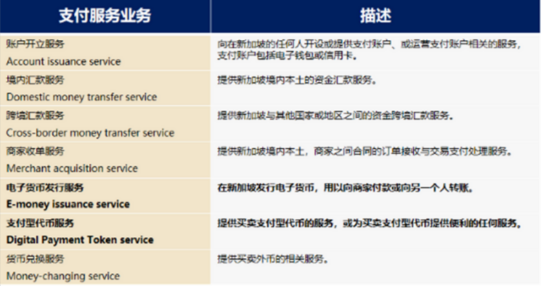 2020 年 1 月修订后生效的《支付服务法》(Payment Services Act,PSA)负责监管规范新加坡支付服务业务,包括传统的支付业务,如开户服务、汇款服务、货币兑换服务等,也包括了新兴的支付业务,如电子货币(eMoney)发行服务和支付型代币(Digital Payment Token,DPT)服务。