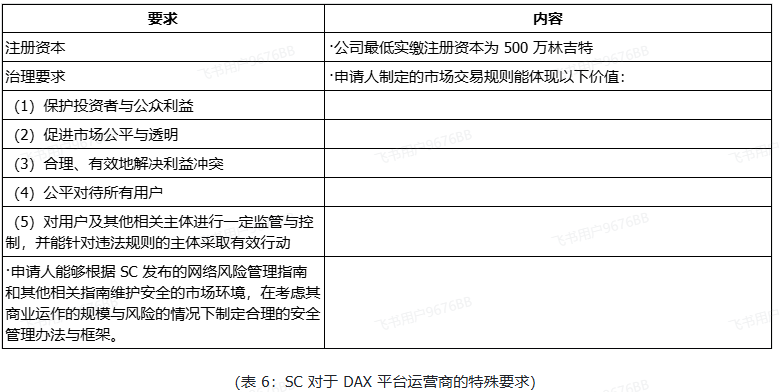 DAX 运营商可以根据 order book 或者 Digital Broker 中的任意一种或两种同时运作,采用 DB 模型(Digital Broker)的需要向 SC另外说明,并提供自己能满足相关要求的证据。DAX 运营商作为特殊的 RMO,其需要符合申请 RMO 时要求的资质以及在《被认可的市场准则》第15 章节规定的针对 DAX 运营商的额外要求,具体如下: