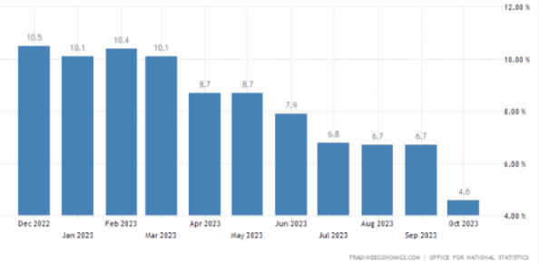 英国通胀率从9月和8月的6.7%降至2023年10月的4.6%,低于市场预期的4.8%。它已从今年初10%左右的通胀率水平恢复过来。与欧元相比,英国的通胀率更高去年,英国的通货膨胀率高于欧元区的通货膨胀率,并且今年(2023年)也将继续保持不变。英国脱欧是英国通胀率高的主要原因之一,原因是进口成本上升以及俄罗斯-乌克兰冲突导致2022年欧洲出现能源危机。