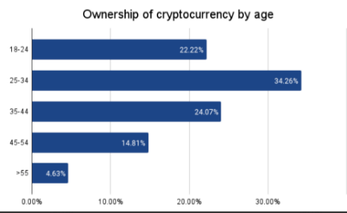 英国大多数加密货币持有者年龄在 18-34 岁之间(占 56%)。其中只有 4.6% 年龄在 55 岁以上这表明加密货币主要由年轻的英国人持有。