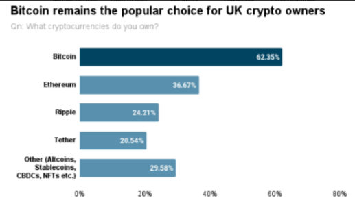比特币仍然是英国加密货币持有者的热门选择,超过 62%的受访加密货币持有者拥有比特币。以太坊紧随其后,凭借加密货币的广泛应用案例位居第二,其次是瑞波币(XRP)、Tether(USDT)和其他山寨币。
