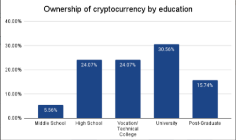 英国加密货币持有者受教育程度较高,46% 的人拥有本科或以上学历。调查结果显示:英国加密货币用户以受过教育的年轻人为主,因此对新技术的接受度更高。同时,他们也愿意接受加密货币的风险,因为他们的投资时间比中年或老年用户更长。