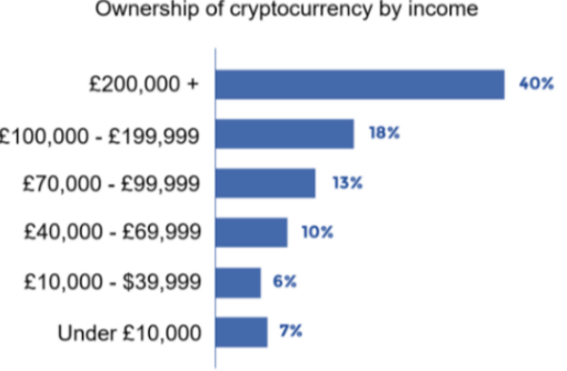 从数据来看:富人的持有水平更高。接受调查的持有加密货币的英国人中,40%的收入超过 20 万英镑,18% 的收入在 10 万至 20 万英镑之间。加密货币的性质吸引了那些拥有大量可支配收入并接受更高风险投资的人。
