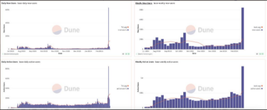 (3)Base 链上数据持续攀升根据Dune的链上图表数据,其新用户量持续爆炸式增长态势,每日交易量和手续费收入也同步上升,截止3月19日,链上地址总数超过了470万。