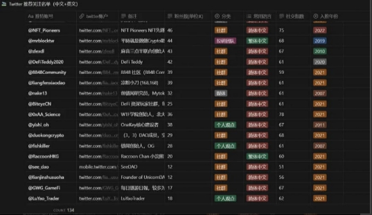 借助 twitter 等社交平台。如果你能把主要的一些加密博主都关注、同时也能够关注一些经常谈论加密话题的名人账号、甚至一些经常提供 Alpha 信息的账号(粉丝量一般是几千左右),那么剩下的就看你个人的时间精力了,因为这个圈子里面的大部分新的财富密码都散落在 twitter 里面,只是不太容易提前感知和发现而已。
