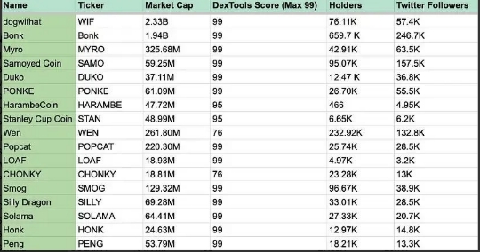 比如你对 WIF 这种以小动物为主题的 MemeCoin 比较感兴趣,并且你认为接下来小动物 MemeCoin 的叙事还会持续,那么你就可以将那些你看到且认为有机会的 MemeCoin 都列出来,并去密切关注他们的变化。同时,你还可以再借助上面提到的 dexscreener 此类的工具去不断捕捉新的相关币种信息来完善自己的监控清单。