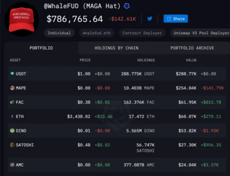 MAGA(Maga Hat),为Make America Great Again(特朗普2016年的竞选口号)缩写,l0go为特朗普标志性红色帽子。团队于6月19日宣布与DWF Labs搭建合作关系,但内部于7月14日出现分歧,Maga官推(@MagaHAT ETH)宣布创始人FUD(@WhaleFUD)退出团队,而WhaleFUD则发推表示并非自愿退出。随后WhaleFud持续通过uniswap、1inch等DEX卖出MAGA,目前标记地址内的MAGA代币已经出清。与原团队争执后Whalefud开始推广一系列特朗普主题小市值代币,包括#MARRON(特朗普儿子名字)、#MAPE(Maga Pepe)#HAIR等,目前其地址非稳定币的最大持仓为MAPE。