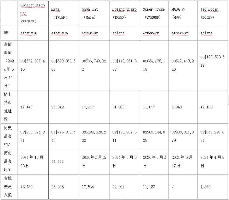 对后续猜测:本板块呈现并可能持续保持资金相对分散、注意力容易转移、炒作节奏快的特点。TRUMP同名代币的资金被Super Trump、Baby Trump等代币分散,Whalefud带领粉丝出逃maga,各个链上多个同名代币竞争,都表明了该板块特性。以及基于特朗普善用媒体、善于营销的特点,因此推测有由特朗普言论、新的政治口号催生更多meme代币的可能性,导致很难有一个代币统一社区共识。