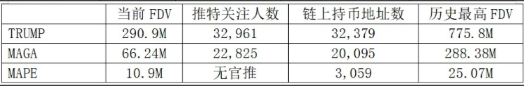TRUMP(Maga),与特朗普同名代币,目前是该主题内市值最高的meme,近期表现相对乏力。