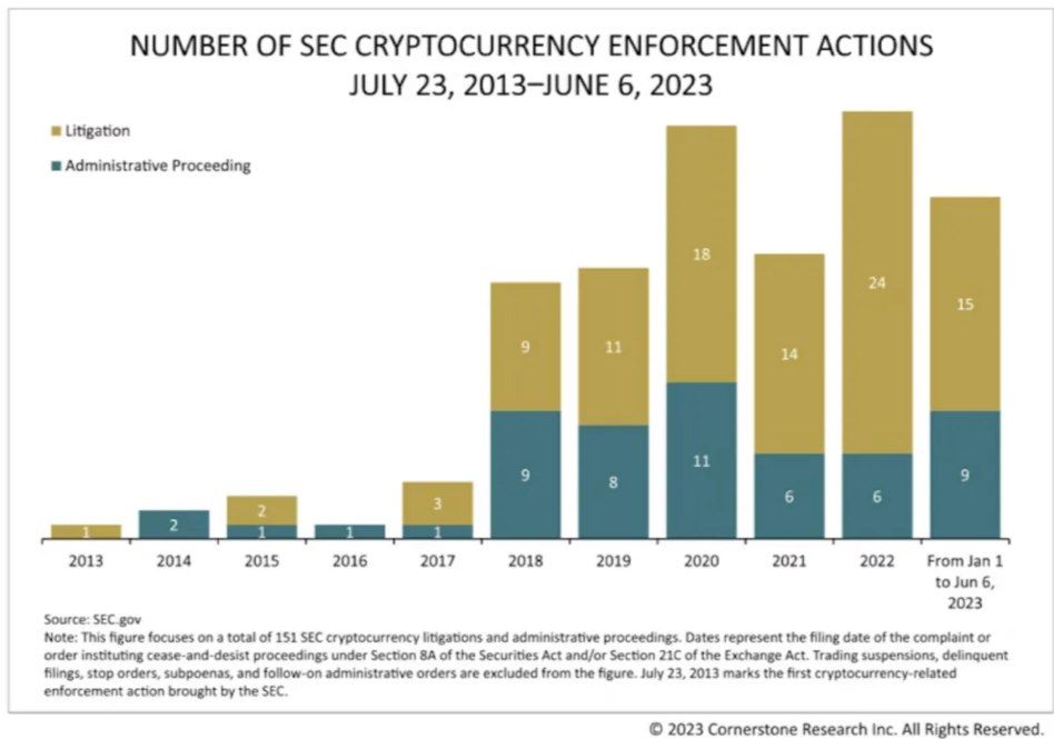 注:2023年6月6日至2023年12月31日,SEC针对加密的案件有14起,2024年1月1日至2024年6月10日当年针对加密的案件共6起。