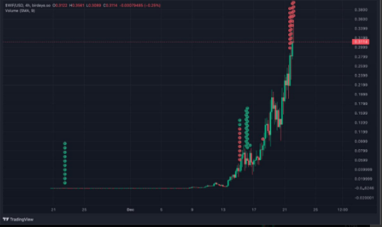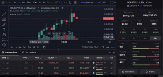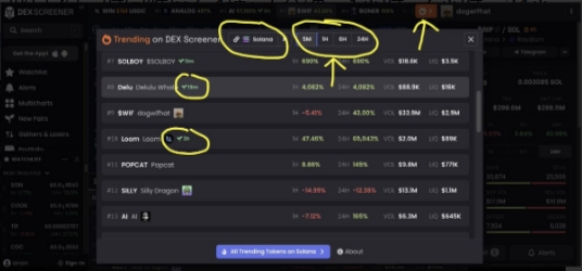 Solana 链上找到一个当下最热门的土狗币,点击去后,找到K线图上方偏右侧的图标点开就是一个信息极其简约的弹窗,上面罗列了当下最热门的土狗,时间维度有4种:5分钟、1小时、6小时、24小时,默认选项:6小时