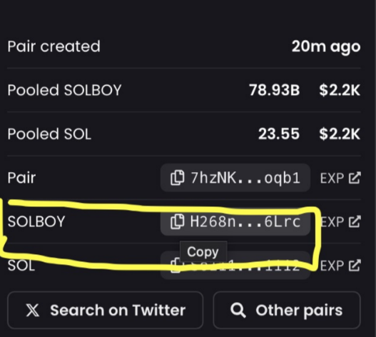 右侧是价格涨跌幅度、流动性池大小、交易额、FDV、买卖交易tx数等信息,供你判断一般而言,池子厚(金额高)、FDV适中(太小了没人玩,太大了涨不动),可能会比较合适页面拉到最底下,中间黄色方框的,是代币的 SPL 合约地址,就是这个 H268n 开头的,上方的 Pair 是流动性池的地址