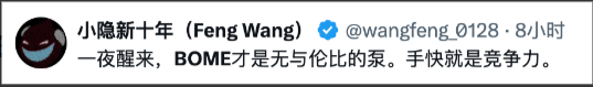 焦虑了吗?没事的,其它项目方比我们更焦虑。bome3天走完别人一辈子的路,就像你的女神你舔了一辈子都上不了,别人三天就把她嗯哼了。