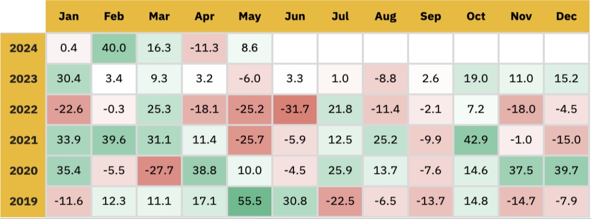经历了4月份的动荡之后,加密市场在5月份反弹,总市值收盘上涨8.6%。美国证券交易委员会(SEC)初步批准现货 ETH ETF,以及美国众议院通过《21 世纪金融创新与技术法案》(FIT21)是推动全市场上涨的两项重大监管进展。这些事件发生之际,美国政治竞选活动仍在继续,各候选人都在讨论他们对加密货币的看法。最后,现货BTC ETF 连续 14 天实现净流入,为市场整体的积极表现锦上添花。