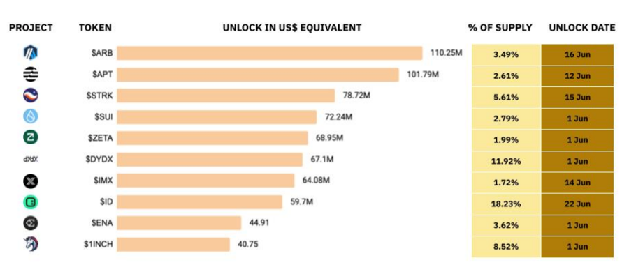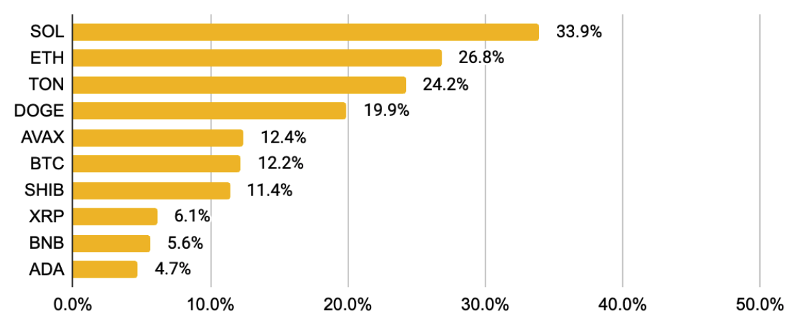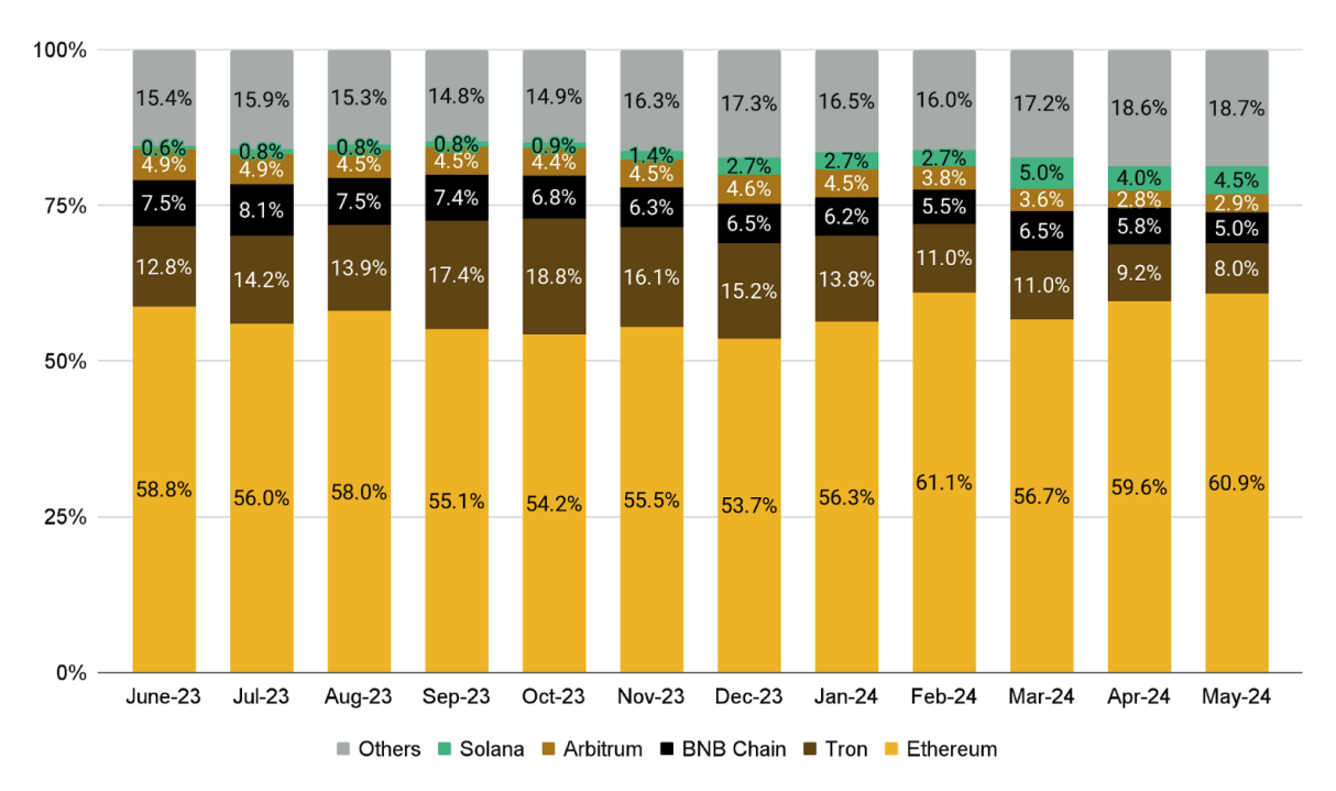 按市值计算,排名前十的代币在月底均实现了价格上涨。Solana 是5月份表现最强劲的代币,其价格飙升33.9%,其 DeFi TVL 飙升 33.4% 至 48.4 亿美元,而其每月链上 DEX 交易量达到 312 亿美元。这主要是由于Solana上的 memecoins(例如 BONK和 WIF)表现强劲。
