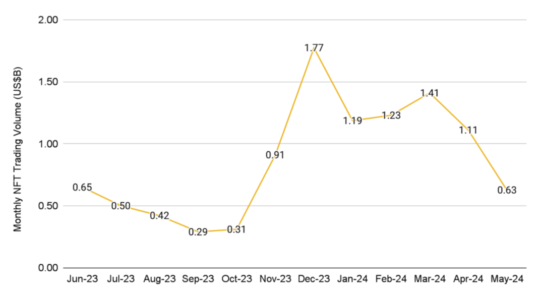 与整个行业动态相反,NFT 市场在5月份出现了大幅下滑。总销售额为 6.3 亿美元,较4月份下降了 41%。尽管Ordinals 仍然是销量最高的收藏品,但当月销量下降了 71%。其他顶级收藏品,包括 NodeMonkes、CryptoPunks 和 Bored Ape Yacht Club,销量也大幅下降。顶级区块链均表现不佳,NFT 销量大幅下降。尤其是比特币,5 月份从 6.02 亿美元大幅下跌至 1.94 亿美元,跌幅达 68%。不过,也有一些积极因素,Blast 上的集换式卡牌游戏 FantasyTop于5月1日发布,成功扭转了负面趋势。