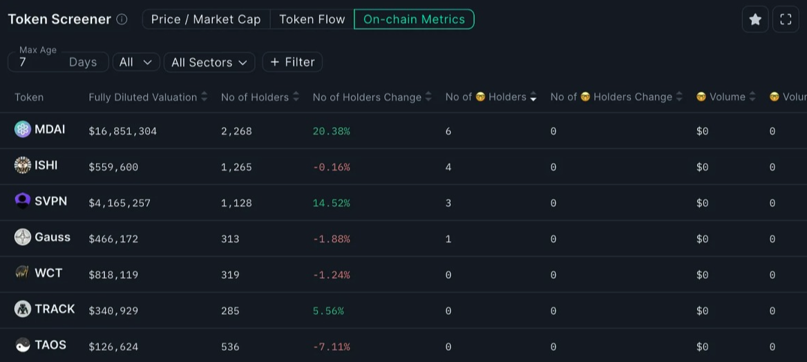 下图显示7天内部署的代币,我喜欢持币者数量随成交易量成长的专案