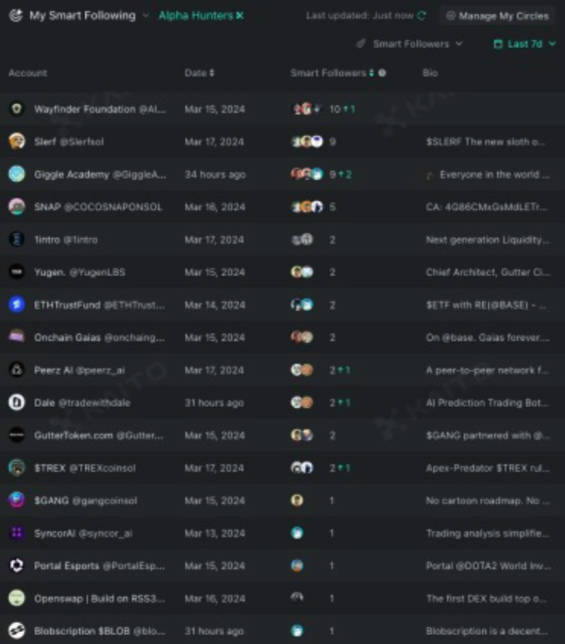 Kaito 的 「Smart accounts」是寻找百倍币最简单的方式之一,通常我会观察7天内 Smart Money 是否关注了哪些帐户,