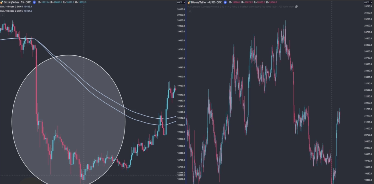 进入多头的规则是,首先大时间周期和小时间周期最好保持4倍数以上,比如先在4小时图表标记出支撑位置,然后在1小时或者15分钟图表观察,价格是否偏离均线的幅度过大。
