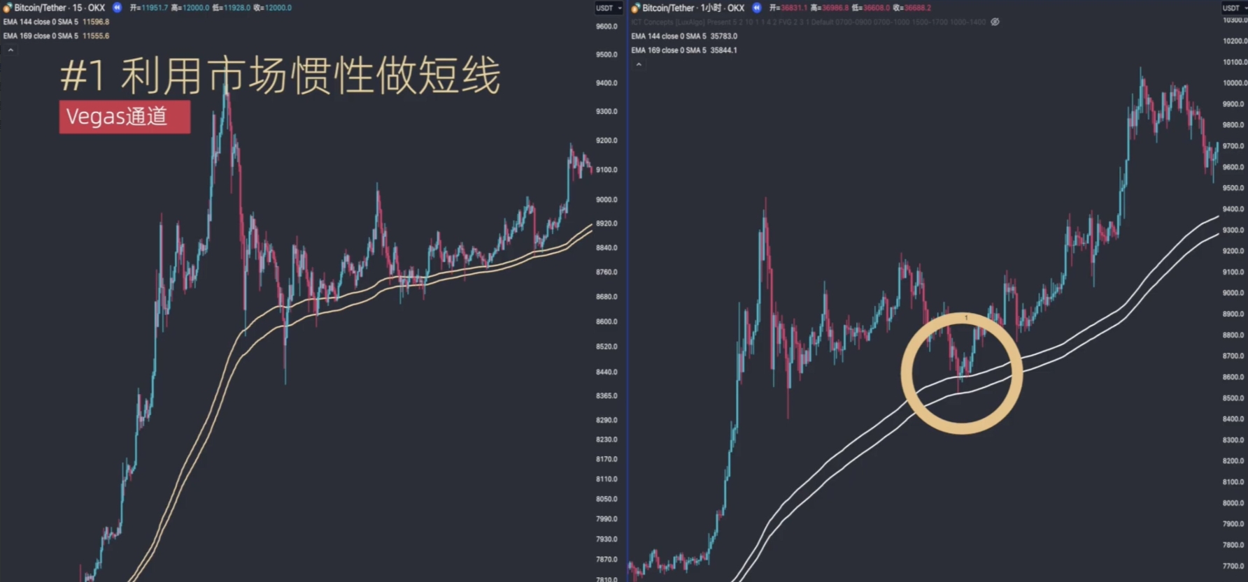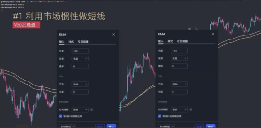 这里用到的是EMA144和EMA169两条指数移动平均线,两条均线组成的区间也被称作Vegas通道,通道经常可以对价格提供肉眼可见的非常有效的动态支撑和阻力~