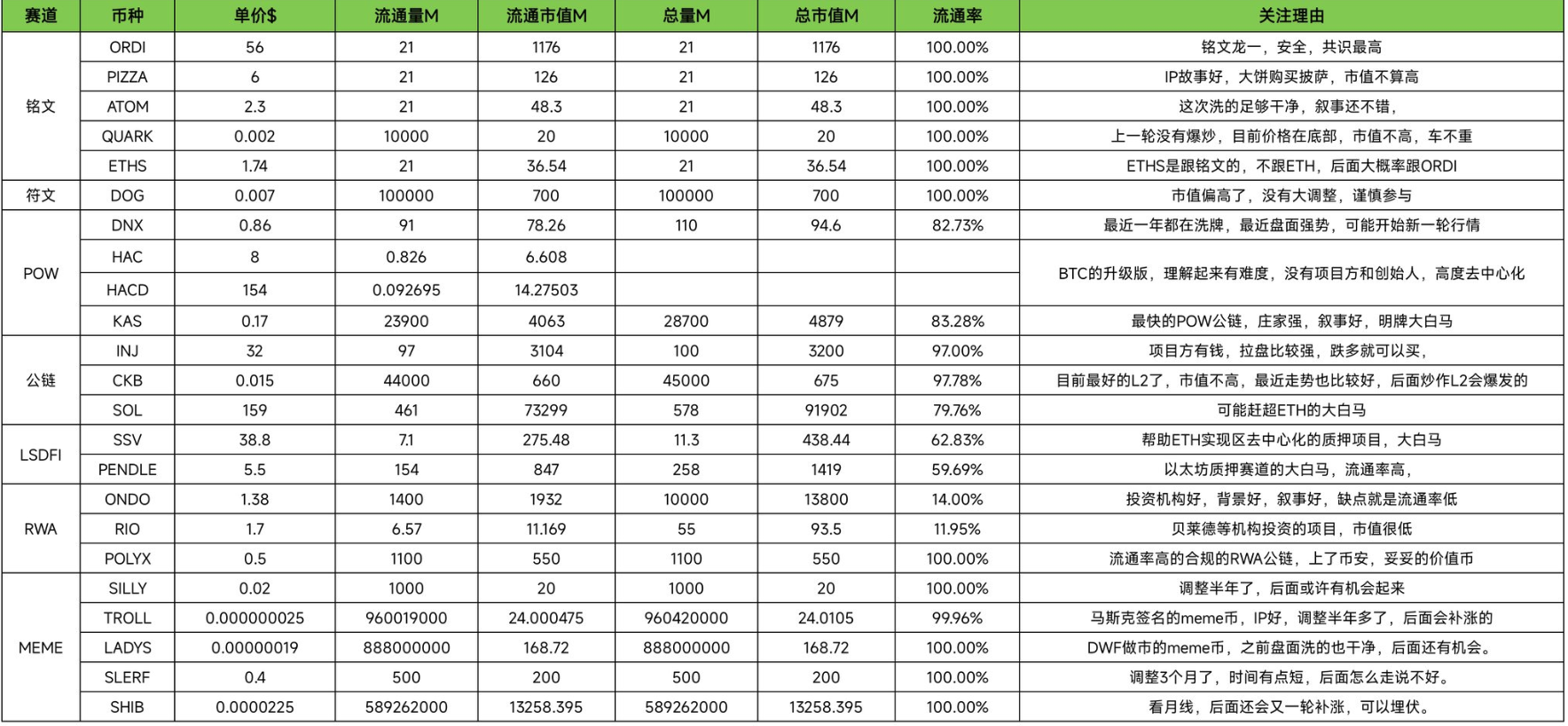 包括 #MEME币 和、#铭文、#公链 等二级市场优质币等,我会附带该资产推荐的原因,让大家更好的判断,
