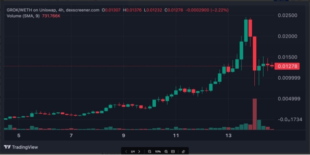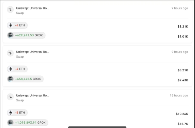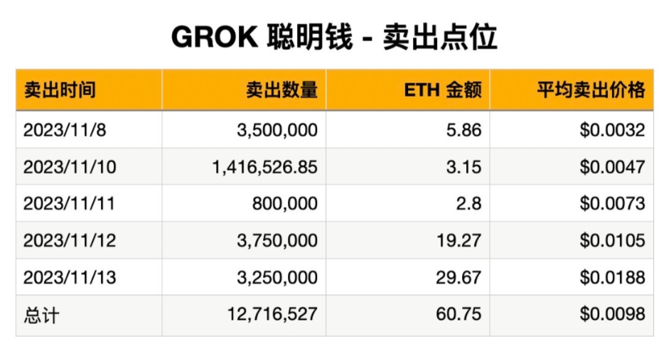 地址 lucidream.eth 分别在 11.08/10/11/12/13 五天内卖出累计 1271 万枚 GROK,兑换为 60.75 ETH,获利59.35 ETH,价值 12.2 万美金!