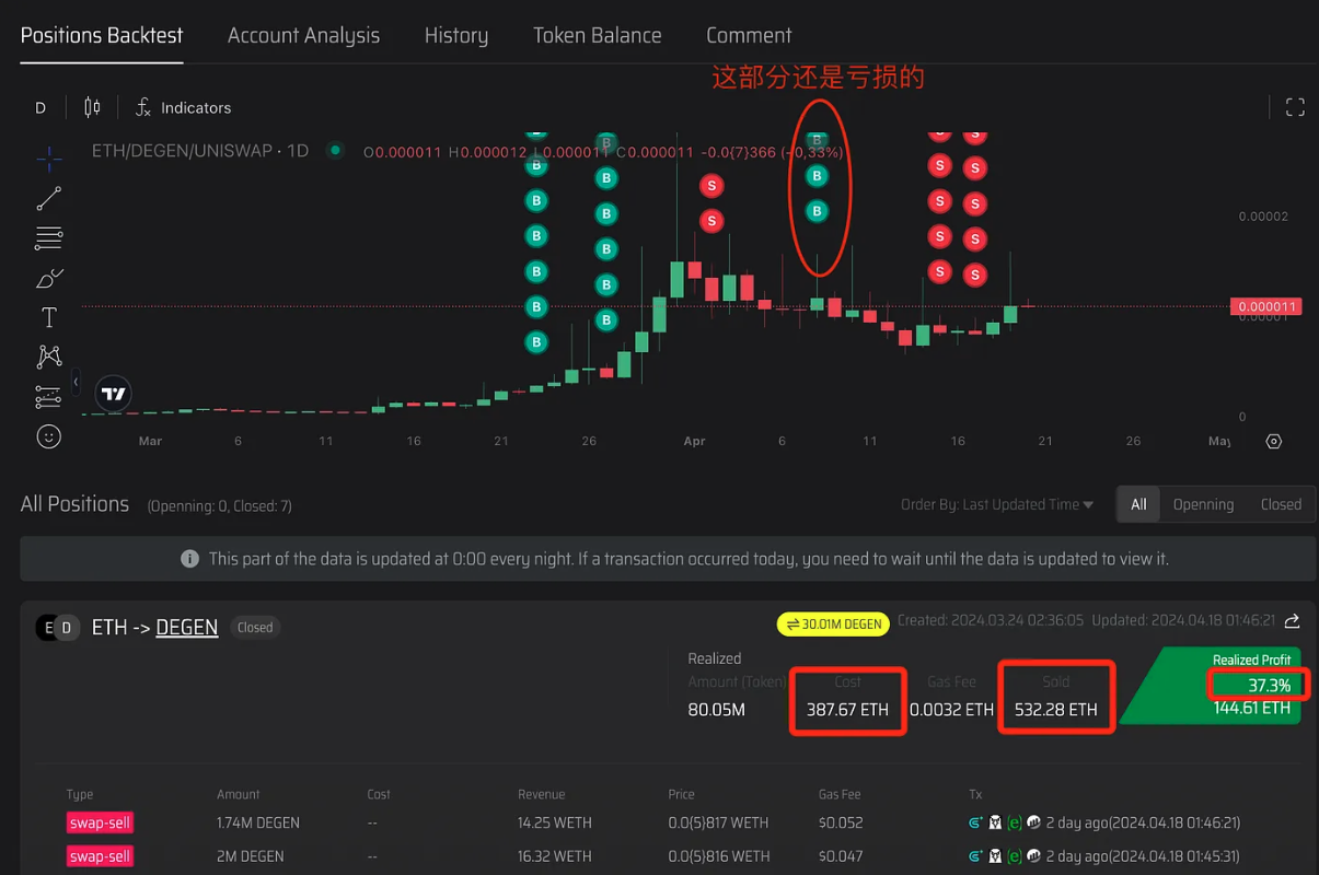 做 Degen,赚了 144个 ETH买了 387个ETH,卖了 532个ETH,虽然赚了144.61ETH, 盈利只有 37%。即使你跟上了,你资金小,赚这个 37%,都不够交手续费。该地址不适合跟单。
