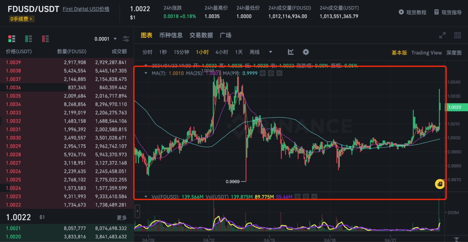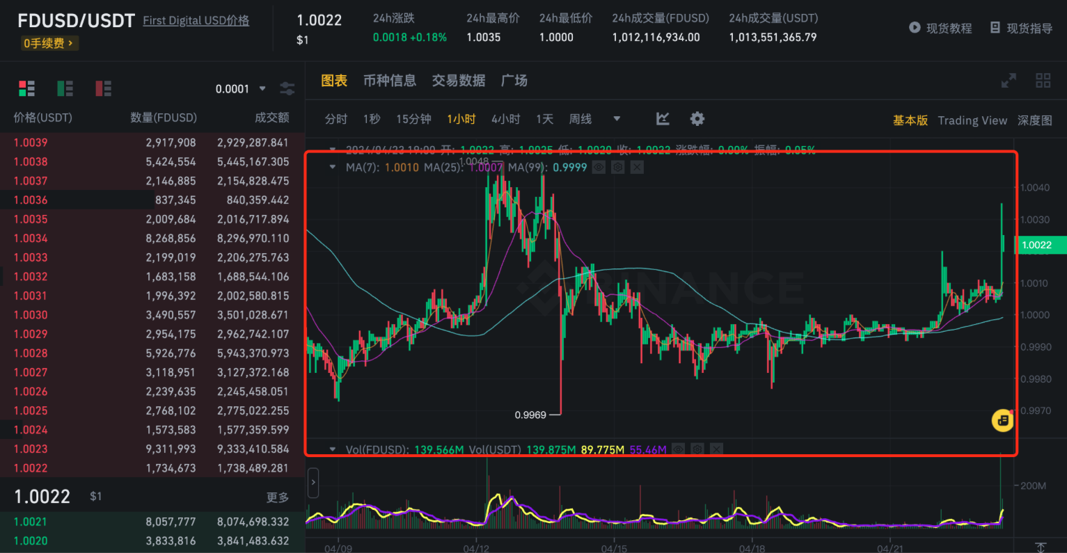 $FDUSD 在BNB IEO开始前的价格会低于USDT,在币安ieo开始后的价格会高于usdt,差价在0.6%左右,且FDUSD可以免手续费,里面存在套利空间。