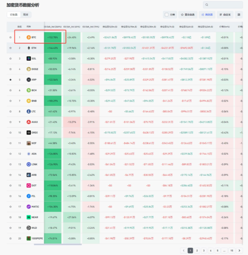 比如rvn涨之前2天,这里持续上榜,保持300%以上甚至btc上涨前也会有这这样的数据,这就是OI/VOL