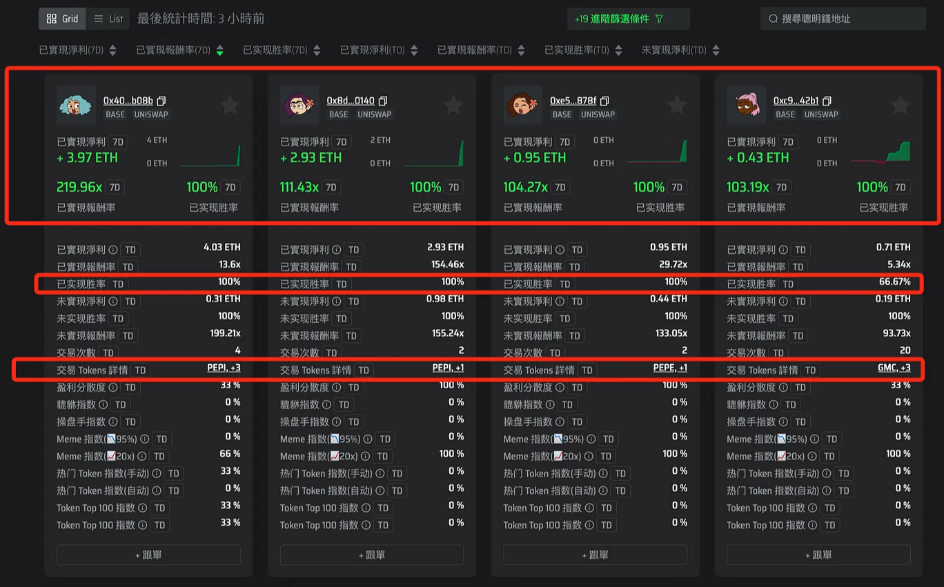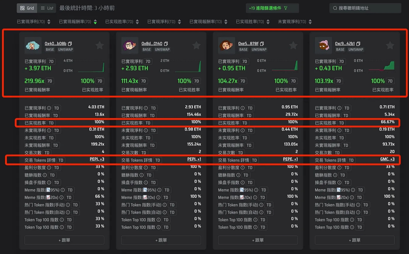 很多小白用户,为了怕亏钱,觉得赚多少钱,或者回报率,都还行,只要赚钱就行,不能亏钱,所以就找那种 胜率 100% 的地址。我们除去所有过滤条件,然后按照胜率 100% 排序看一下。