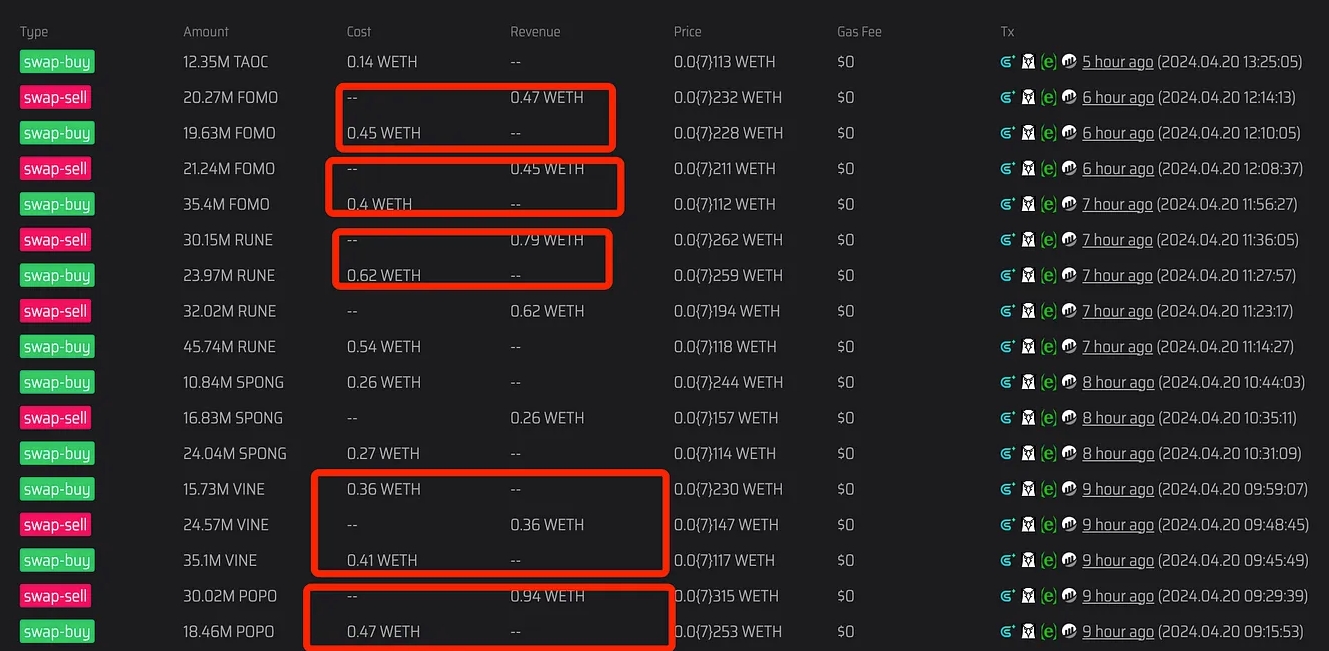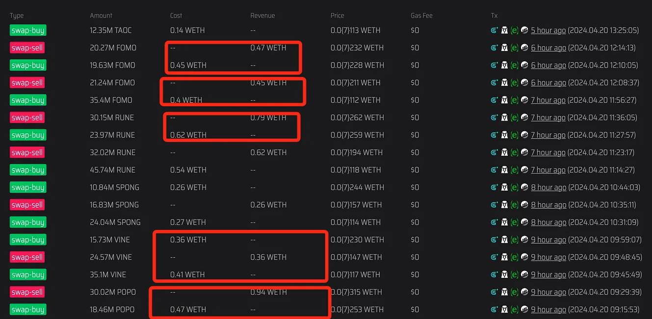 再看交易明细,基本也是套利赚钱的。但是再进一步分析交易资产,发现全是小资产,很大一部分最后都成了貔貅,资产风险过高,也不适合小白跟进