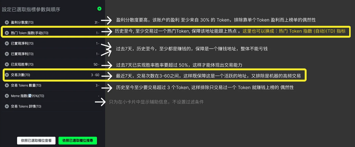 其中黄框部分,我们可以微调,比如 热门token,可以换成自动识别的 热门token,交易次数,也可以再加一个【交易次数(1D): 1】过去一天至少交易一次,这样可以筛选出更活跃的交易员,
