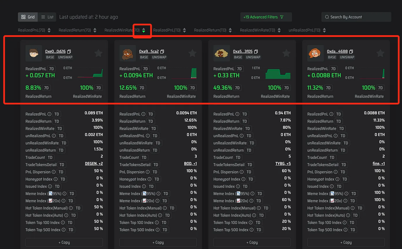 很多小白用户,为了怕亏钱,觉得赚多少钱,或者回报率,都还行,只要赚钱就行,不能亏钱,所以就找那种 胜率 100% 的地址。 我们除去所有过滤条件,然后按照胜率 100% 排序看一下。