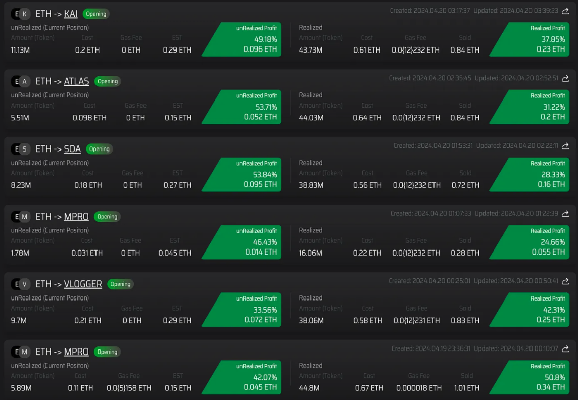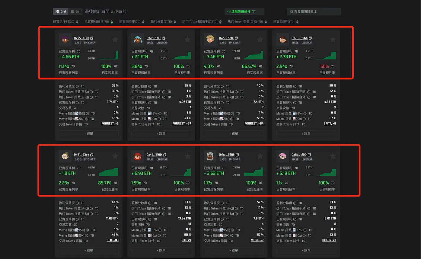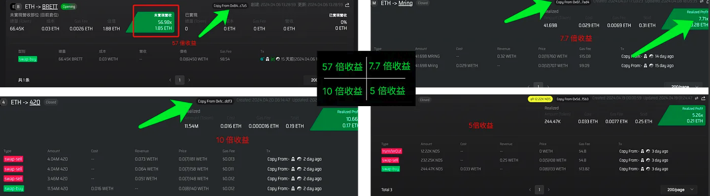 现在看上去就正常很多了,不管从盈利,还是翻倍情况,都比较符合预期。 筛选出来的 地址,一般就不会太多了,估计有几十个地址。 这个时候,我们需要做的就是,找出你看得顺眼的地址,进去看一下,只要交易的不是貔貅盘的地址,基本都可以进行无脑跟单。