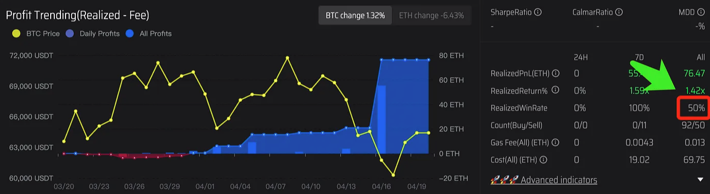 点位比第一名要好。不过,花了 71 ETH,赚了3倍。是不是我们这个就可以跟单了呢?再看他整体胜率,只有 50%。基本他赚这个钱,偶然性太强了。不适合跟单。