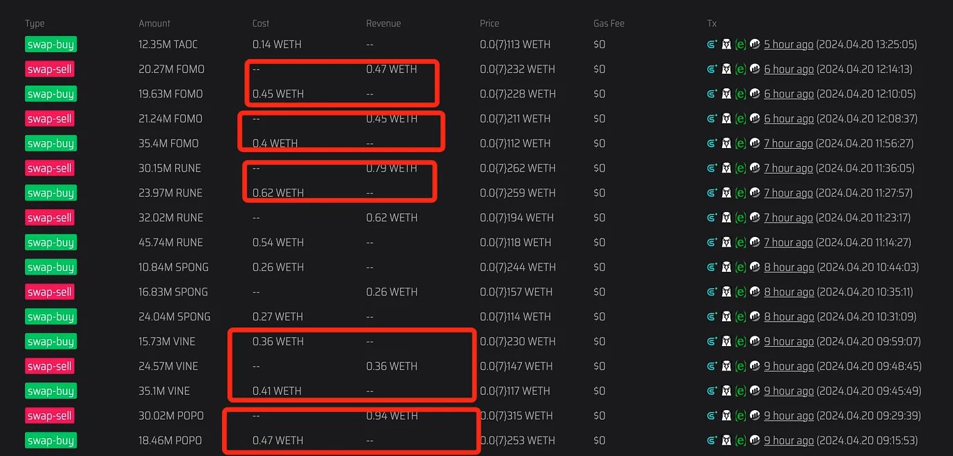 Tips2:识别交易的 Token 是谁不貔貅。可以从地址的貔貅指标査看。也可以回测每个地址的 Token 仓位,看看曾经交易的这些 Token,现在是不是都撤池子里,回测过程中,如果发现一个 地址曾经交易的 Token 是貔貅。那么此地址不管数据多好,都不值得跟单。