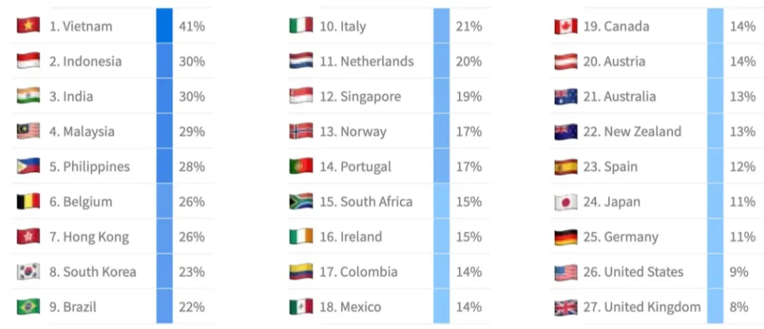 在Finder的一份加密货币采用率报告中,排名前5的都在亚洲,其中香港居民对加密资产的的拥有率为26%,考虑到香港作为全球金融中心的地位,这一数字并不令人意外,事实上,香港拥有比特币的比例最高(18%),总体排名第二,仅次于越南(20%)。