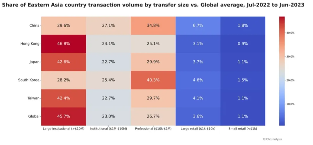 Chainalysis的一份报告显示:按原始交易量计算,香港是一个非常活跃的加密货币市场,2022年7月至2023年6月之间收到的加密货币估计$640亿。尽管香港的人口占中国大陆的0.5%,与同期中国的$864相比更为亮眼。重要的是,香港的人口基数和产业结构,更多是在加密领域复刻其作为全球TOP3金融中心的模式和框架,这点与新加坡、伦敦类似,但是与迪拜、土耳其甚至美国都有明显差异。