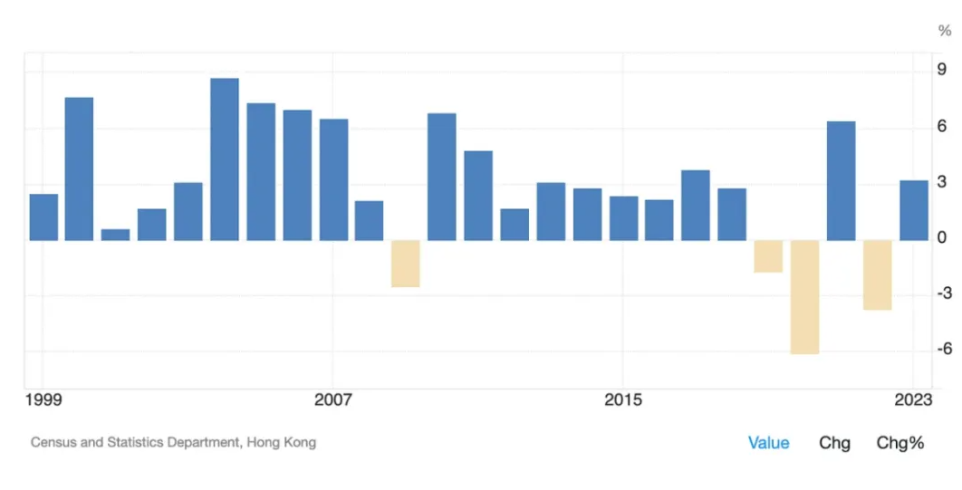 2023年,依据香港特区政府统计处发布第四季度及全年环比物量计算按经济活动划分的本地生产总值初步数字,在服务出口和固定投资强劲反弹以及私人消费显著增长的支撑下,香港本地生产总值在2023年第四季度较上年同期实质上升4.3%,2023年全年与2022年比较,本地生产总值实质上升3.2%。